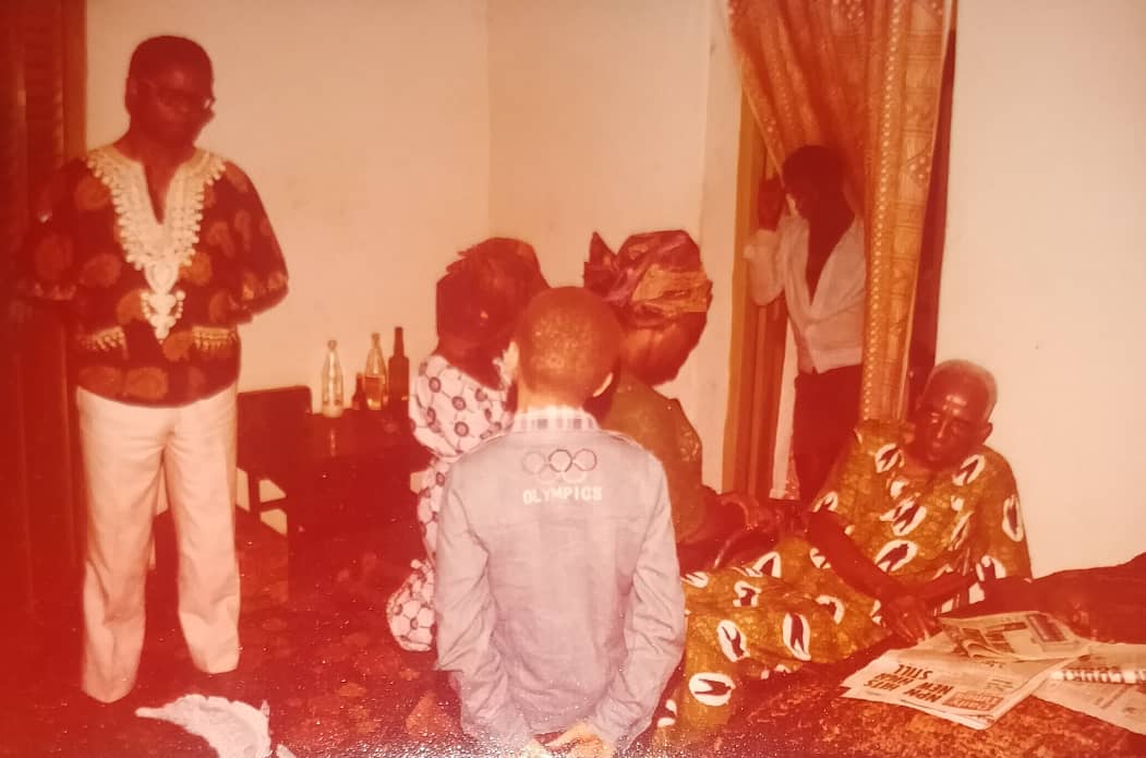Mama, Ama and Oluchi her young children, and her relative Mrs Joy Okereke respectfully kneeling before her father, The Distinguished Mazi Solomon Walton Okereke to pray for them.